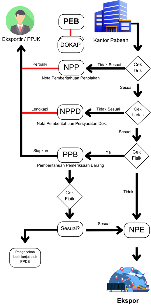 1. Eksportir/ Kuasanya menyampaikan dokumen Pemberitahuan Ekspor Barang (PEB) ke Kantor Bea Cukai tempat pemuatan.